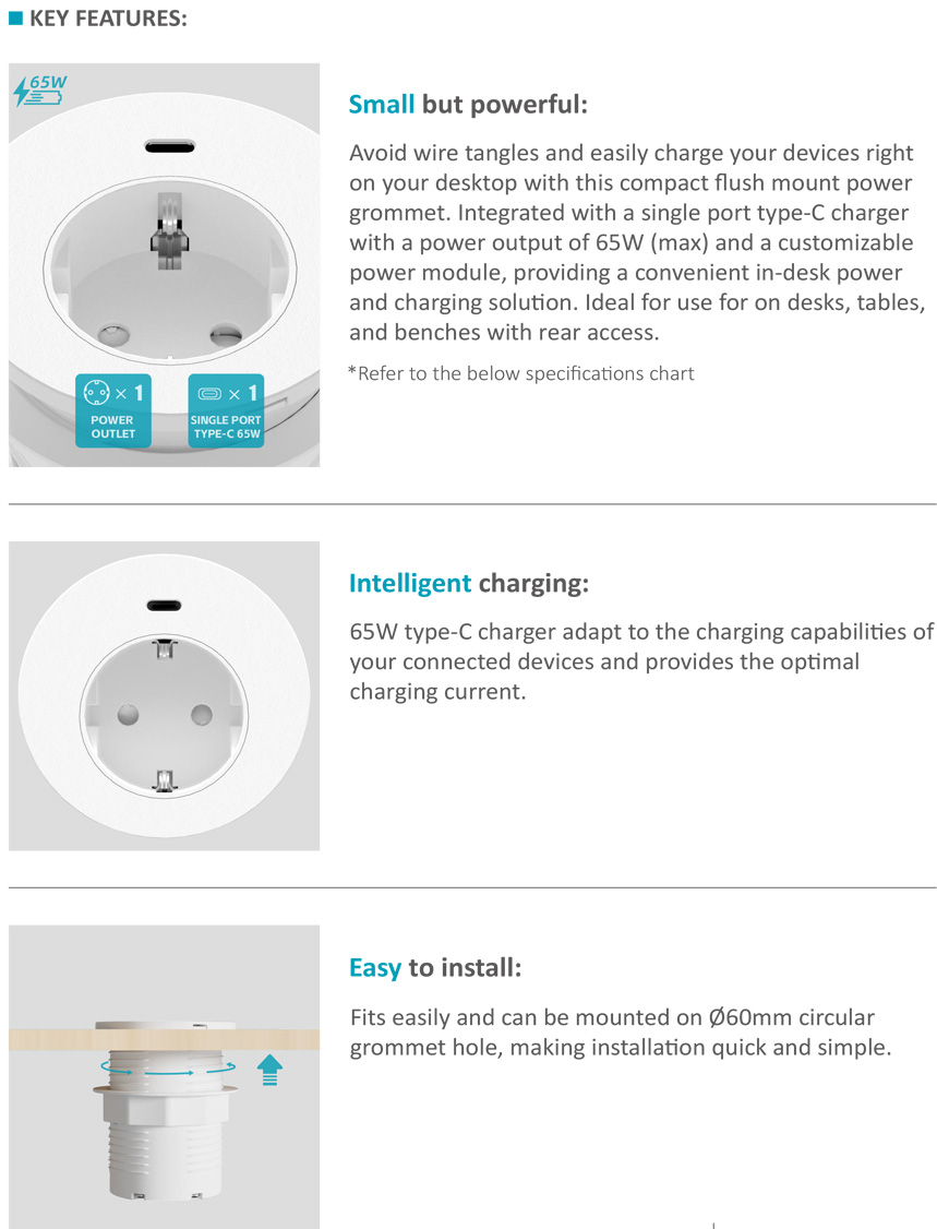 STS-R70 In-desk power grommet with single port 65W USB-C chargerBack >
