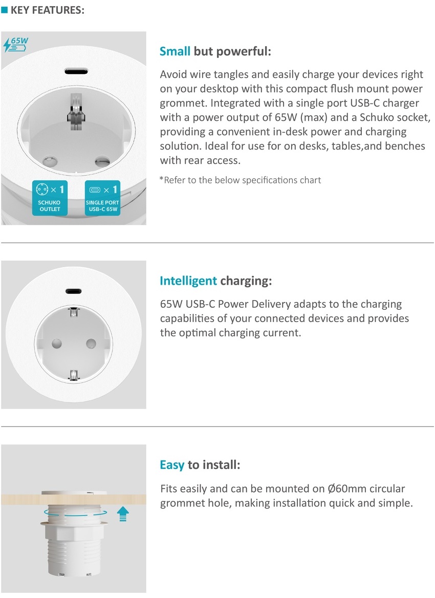 STS-R70 In-desk power grommet with single port 65W USB-C chargerBack >